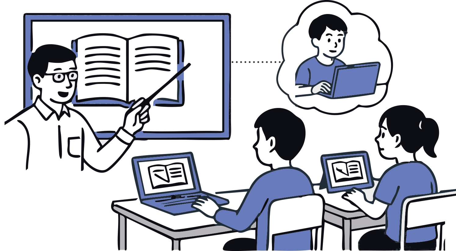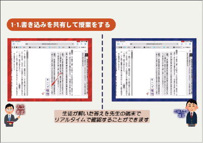 教室にいる先生と生徒、そして自宅や別教室など遠隔地から参加する生徒が、同じデジタルブックを使って授業に参加するスタイルです。