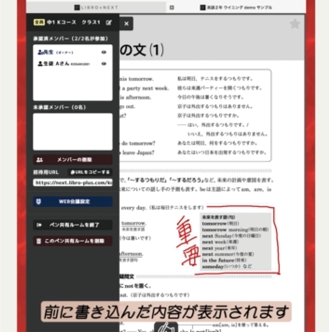 みんなでペンツールは、LIBRO+上のデジタルブックに書き込んだ内容をリアルタイムで他のユーザーと共有できる機能です。離れていても、まるで同じ教室・会議室にいるような、対話型のコミュニケーションを実現します。