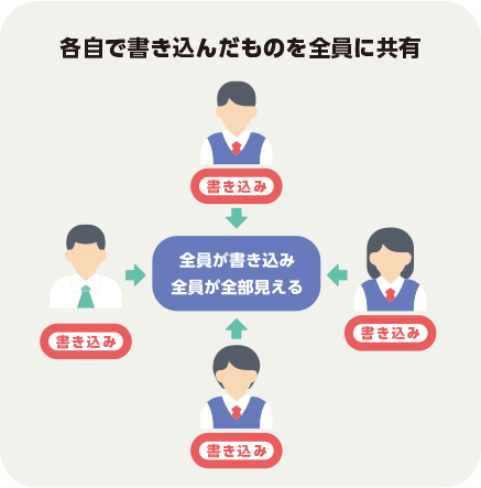 設定した範囲でメモを共有。多人数で同時に書き込んでリアルタイム共有、1対1の個別共有でグループ/個別学習に活用可能。過去の共有を保存できるのでいつでも再開、また再利用することができます。